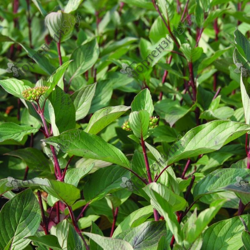 Дерен белый (Cornusalba) Сибирика- декоративный, листопадный кустарник, отличающийся своей необычной окраской. Он неприхотлив и очень хорошо разрастается, достигая двухметровой высоты. Кора ветвей блестящая, красноватого оттенка. Листья эллиптические, заостренные, темно-зеленого цвета. Осенью листья окрашиваются в пурпурный цвет. Цветет обычно в мае-июне, не обильно, шаровидными, кремово-зеленоватыми соцветиями до 4-5 см. в диаметре. Плоды мелкие, круглые, сине-голубые с восковым налетом. Корневая система состоит из множества мелких и тонких корней, именно поэтому куст может быстро высохнуть в условиях жесткой засухи. В остальном дерен белый (Cornusalba) Сибирика одинаково хорошо переносит морозную зиму и жаркое лето. Долговечность кустарника – более 25 лет.