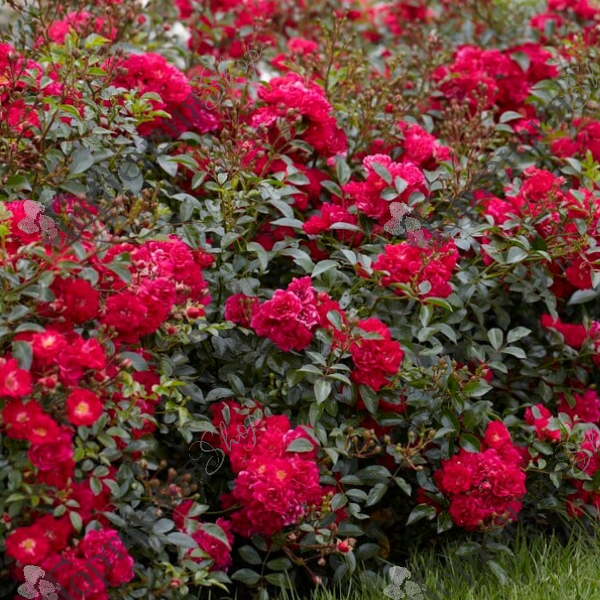 Роза миниатюрная 'Fairy Queen', Rosa 'Fairy Queen' - мощная, компактная почвопокровная роза, высотой до 60 см, с темно-зеленой листвой. Цветки небольшие, очень махровые, округлые, малиново-красные цветы с легким ароматом, повторное цветение с лета до осени.