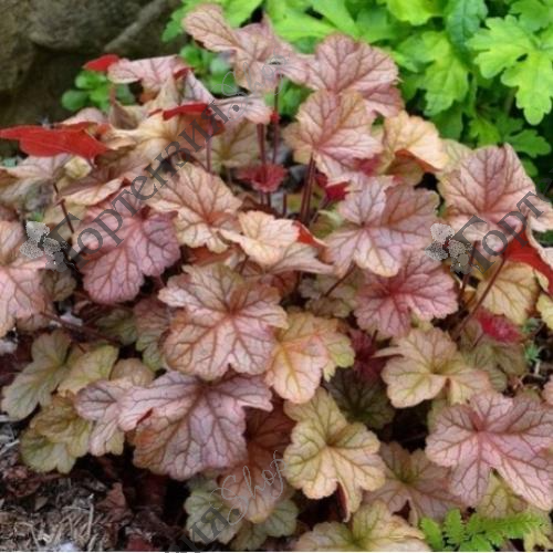 Гейхера«Пино Грис» – многолетнее корневищное, травянистое растение высотой до 25-30 см. На одном кустике соседствуют листики розовые, персиковые, кремовые и зеленоватые. Весной они рыжевато-розового цвета с серебром, летом приглушенно-розовые с серебристым напылением. При этом они имеют красивую округлую форму, волнистые, слегка зубчатые, приятные на ощупь и украшены замысловатым узором из ярко-розовых прожилок. Подкладка листьев фиолетово-розовая. Цветки мелкие, колокольчатые, кремово-белые. Образует компактный куст шириной до 40 см. Цветет в июне-июле. Предпочитает солнечные или полутенистые места, плодородные, достаточно увлажненные почвы, без застоя воды. Нарастает довольно быстро. Размножается делением корневища или черенкованием розеток весной. Зимостойка, но от раннего солнца весной требуется притенение.
