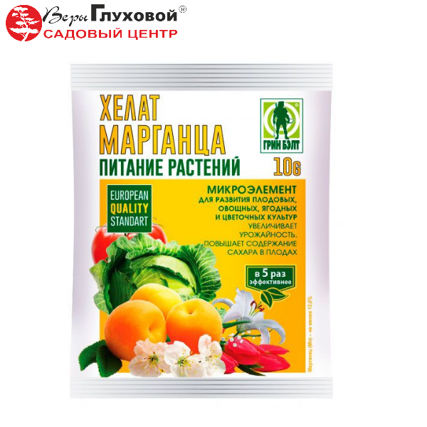 Хелат марганца — универсальное микроудобрение,для плодовых, овощных, ягодных и цветочных культур, применяется при дефиците марганца в почве..При недостатке марганца резко снижается урожайность, ослабляется рост корней.Недостаток марганца у растений вызывает хлорозы, пятнистости, ожоги.